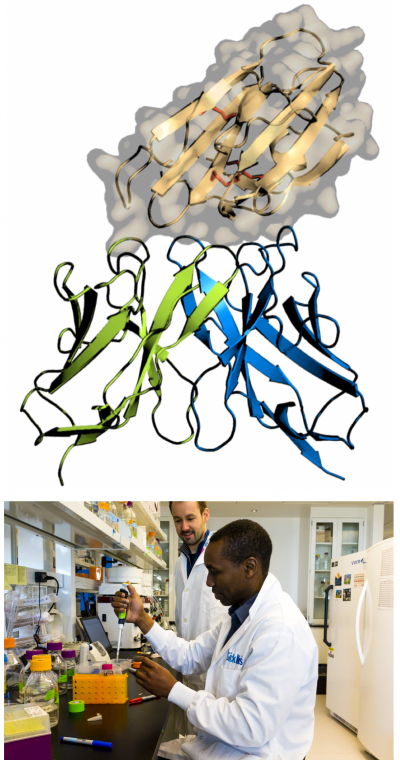 Top: Crystal structure of the malaria protein (Pfs48/45, orange) being recognized by the humanized blocking antibody (TB31F, green and blue). Bottom: Jean Philippe Julien (left) and his collaborator, Laboratory Research Project Coordinator Anthony Semesi (right), performing lab work at SickKids.