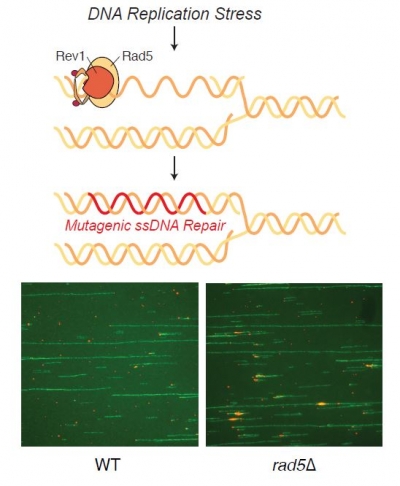 Bottom: Single molecule DNA analysis shows that ssDNA (shown in red) accumulates on DNA (shown in green) when RAD5 is absent.