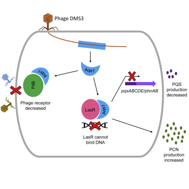In the latest issue of Molecular Cell, the Maxwell, Davidson and Moraes labs identify and characterize Aqs1, a multi-purpose DMS3 phage protein. Aqs1 binds and inhibits LasR, which is required for quorum sensing and the release of several anti-phage defenses in Pseudomonas aeruginosa. But that’s not all. Aqs1 also binds PilB, and thereby blocks pilus assembly. Since the bacterial pilus helps phage to infect, Aqs1 prevents further phage infection.